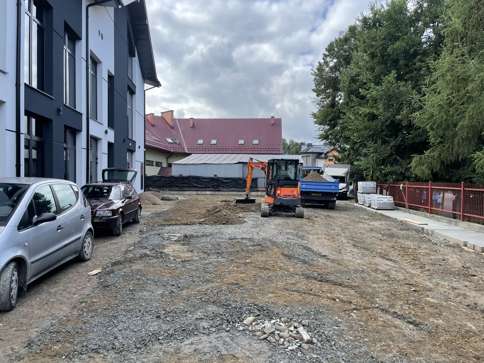 Do tego zadania podeszliśmy jak do operacji inżynieryjnej. Zaczęliśmy od pełnego korytowania i wykonania wzmocnionej podbudowy, zaprojektowanej specjalnie pod duże obciążenia. Następnie precyzyjnie ułożyliśmy grubszą, przemysłową kostkę brukową, tworząc równe i wytrzymałe place manewrowe oraz miejsca parkingowe. Całość prac została zorganizowana w taki sposób, aby zminimalizować utrudnienia w funkcjonowaniu sklepu.